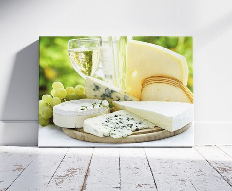 Pahar de vin alb, brânzeturi și struguri, pe fundal verde, tablou pentru bucătărie, cafenea, restaurant